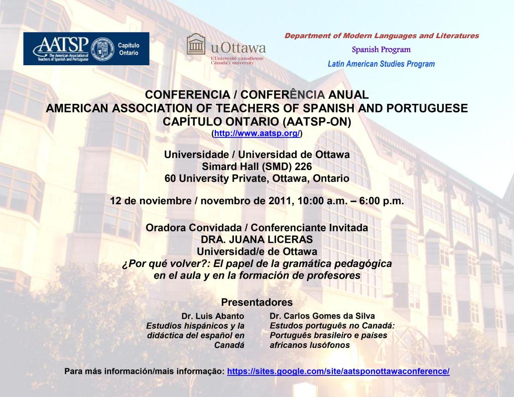 | La Asociación Americana de Profesores de Español y Portugués (AATSP, por sus siglas en inglés), Capítulo Ontario (AATSP-ON), les invita a participar en la conferencia anual “Interculturalidad en Ontario,” que tendrá lugar el sábado, 12 de noviembre de 2011, en la Universidad de Ottawa, con el apoyo del Departamento de Idiomas y Literaturas Modernas y los Programas de Español y de Estudios Latinoamericanos. La AATSP es una agrupación que este año cumple 95 años de trabajo en la promoción y enseñanza de las lenguas, culturas y literaturas hispanas y lusobrasileñas, así como en la difusión de idiomas relacionados, en todos los niveles educativos. El Capítulo de Ontario de la AATSP, el único en Canadá con más de 20 años de existencia, organiza anualmente su encuentro académico para intercambiar ideas y experiencias en pro de la formación del profesorado y la actualización de métodos educativos. El tema de la conferencia es libre y se podrá abordar cualquier aspecto sobre enseñanza de la lengua, lingüística, estudios culturales o crítica literaria. La propuesta debe incluir título, un pequeño resumen (2 párrafos), nombre completo del ponente y el del centro donde desarrolla su actividad profesional. Las ponencias se podrán presentar en español, portugués, inglés o francés. Los interesados en participar pueden enviar sus propuestas por correo electrónico a aatsp.on.conferencia@gmail.com. La fecha límite para enviar propuestas es el 31 de octubre de 2011. La invitación queda abierta para estudiantes, académicos, diplomáticos y el público en general. Se motiva a los interesados en participar en la conferencia a hacerse miembros de la AATSP (http://www.aatsp.org/). Durante la conferencia anual también se procederá a la elección de la nueva junta directiva. Se invita a todos los miembros a nominar colegas o nominarse a sí mismos para optar a los diferentes puestos ejecutivos del Capítulo Ontario para el periodo enero 2012-diciembre 2013. ¡Un saludo cordial y nos vemos en Ottawa! Comité Organizador David Rozotto, Presidente (drozo063@uottawa.ca) Dra. Belén Huarte, Vicepresidenta (bhuartegallego@glendon.yorku.ca) Dra. María Carmen Romero, Tesorera (romerom@tcdsb.org/mcromero@sympatico.ca) Dra. Mignette M. Garvida, Presidenta Anterior (mgarvida@ryerson.ca) |
